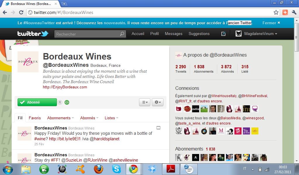 Dunque, da due o tre anni anche le interprofessioni vinicole hanno cominciato ad investire in tal senso: un esempio calzante è rappresentato dall‘interprofessione dei vini d’Alsazia che con la sua pagina Facebook ha raccolto 23.500 fan e dispone di un aggiornato blog. I vini di Bordeaux, i più presenti, contano quattro pagine Facebook in differenti lingue, due pagine twitter, e un blog, lo stesso dicasi per l’InterRhône con 1.900 fan Facebook che hanno tutte le carte in regola per crescere.