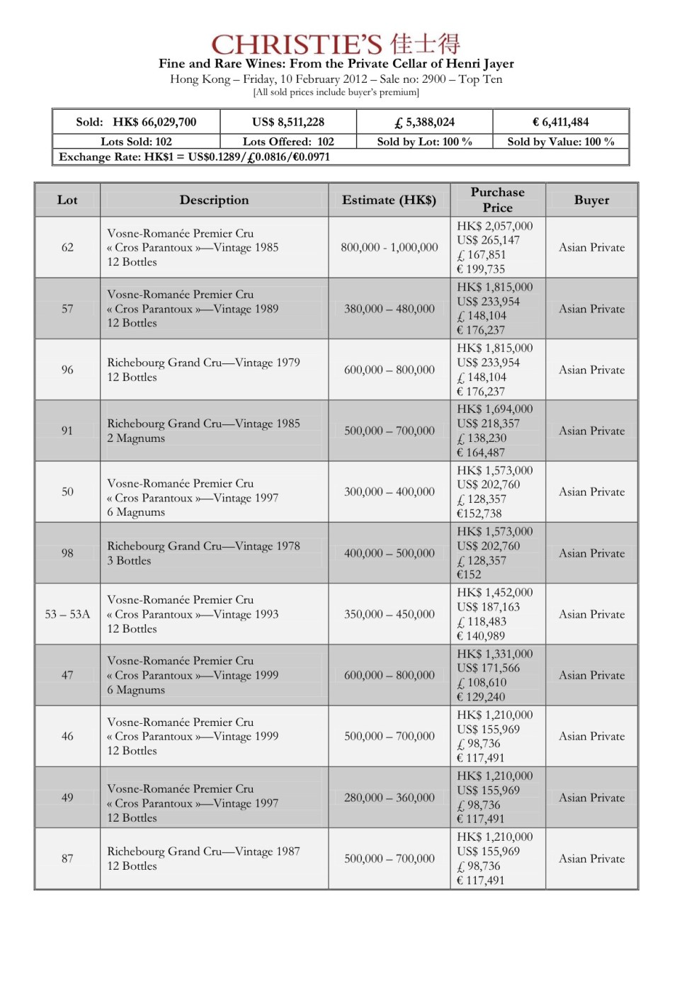 Il miglior risultato? 12 bottiglie di Vosne-Romanée Premier Cru « Cros Parantoux » 1985, venduto a 365.147 dollari >^..^<