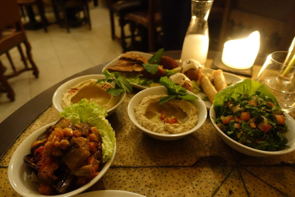 Diversi i tipi di carne che vengono proposti, pollo, montone e agnello, marinati e cotti al forno o alla brace. Contro il mio interesse consiglio di pasteggiare l’intera mezze con dell’arak, servito un un à piccola caraffa.