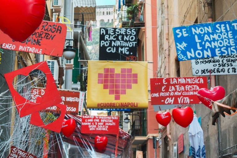 – I Quartieri Spagnoli come non si sono mai visti: la zona più particolare della città merita una visita ad hoc, tra ristoranti economici, moto che fanno acrobazie, altarini dedicati alla Madonna e murales che inneggiano a Maradona, è un quartiere speciale. Anche per le suggestioni che nasconde che, ultimamente, l’hanno fatto scegliere da Michelangelo Pistoletto come cornice della sua opera collettiva “Il terzo Paradiso”.