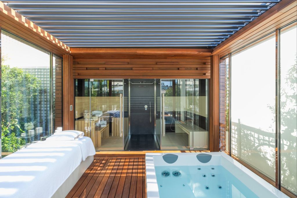 Mais le véritable atout, le secret le mieux gardé de cet appartement d’exception, réside dans son espace wellness privatif. Dissimulé dans un cube de verre enveloppé de verdure, ce sanctuaire de bien-être accueille un hammam, un sauna, une douche, un jacuzzi et une table de massage. Accessible à toute heure du jour et de la nuit, il promet une expérience de déconnexion absolue, un moment hors du temps, à vivre selon son propre rythme. Imaginez-vous vous ressourcer dans votre spa personnel, avec la ville lumière à vos pieds.